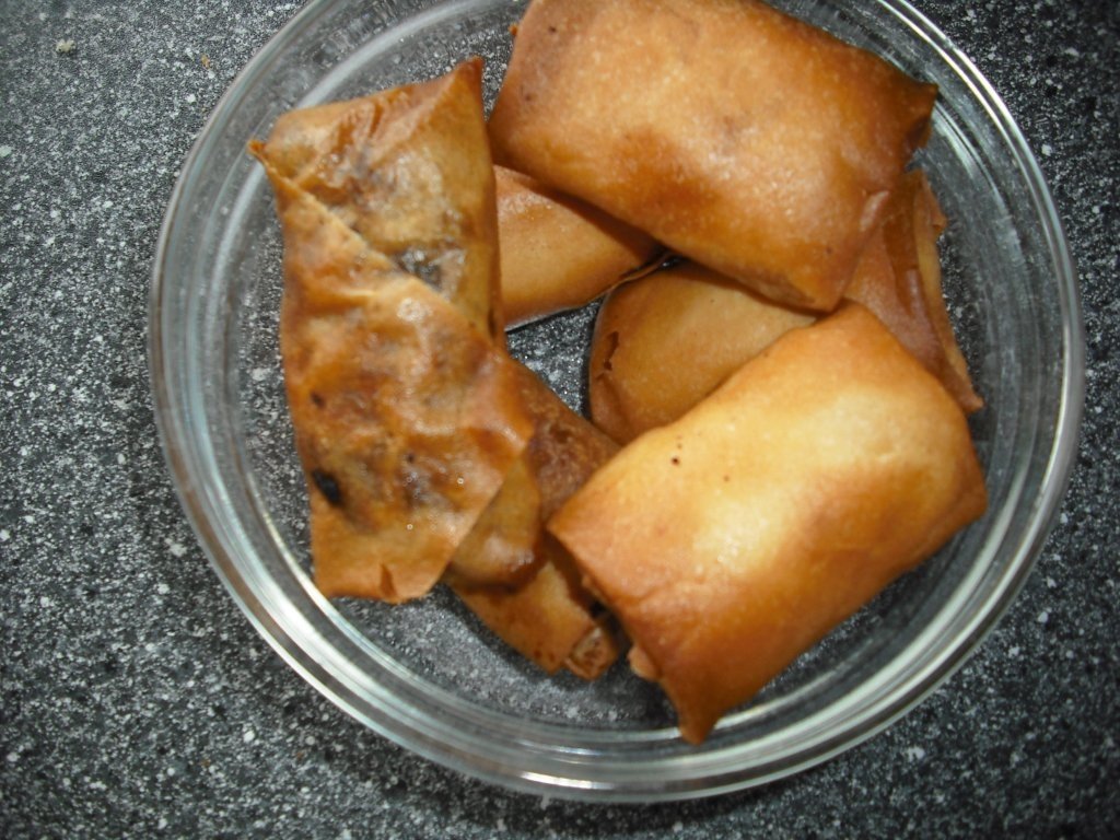 Albusul de ou se pune intr-un castronel, il vom folosi pentru a lipi foaia de orez la colt, pentru a nu se desface.Foile de orez se desfac una cate una (se pot gasi la magazine de specialitate adica chinezesti).Se ia intr-o jumatate de lingura compozitie si se pune pe o foaie de orez se impacheteaza in final iesind un rulou.Din aceasta compozitie vor iesi 50 de rulouri.Dupa ce a-ti terminat de impachetat rulourile le puneti la prajit sau le puteti pune in cuptor cu un pic de ulei.
