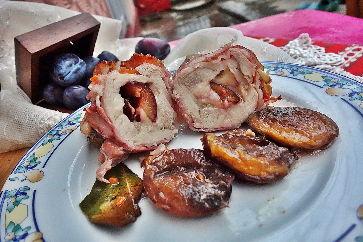 Pulpele spalate si zvantate se mai subtiaza cu un cutit, apoi se sareaza si condimenteaza. Pe fiecare bucata de pulpa se pune cate o felie de cascaval si deasupra lui, 2 jumatati de pruna, se ruleaza cu grija, apoi se prinde cu o scobitoare. Fiecare rulou se infasoara cu prima fasie de jambon, incepand pe lungul ruloului, sa acopere capetele fiecarui rulou, astfel incat sa nu se piarda cascavalul care se va topi apoi cu inca cate 3 fasii infasurate pe fiecare rulou in parte si prinse capetele cu scobitoare. Se asaza unul langa altul in tava mai inalta, se stropesc cu ulei de masline, se presara condimentele, usturoiul feliat, lingurita de legume deshidratate, sare, vinul sec si apoi completam cu apa, dar nu sa le acopere, si pe margine punem cateva jumatati de pruna, pentru a da aroma mai intensa. Se acopera cu folie de aluminiu si se da 30 de minute la foc mare, se da la o parte folia si mai lasam cca 20 minute sa se rumeneasca frumos!
