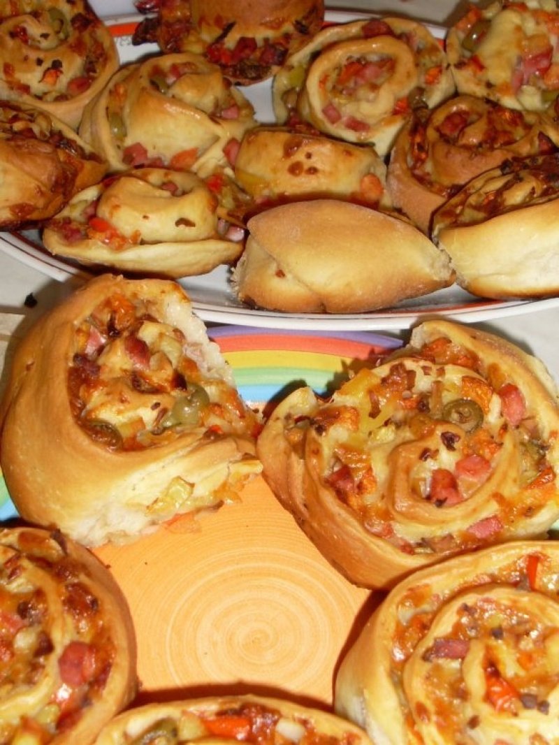 Când e suficient de crescut de aluatul se pune pe placa de lemn şi se frământă, apoi se întinde o foaie de aprox. 1 cm grosime. Foaia se unge cu ulei de măsline şi deasupra se presară ingredientele pentru compoziţie, amestecate, întinse pe toată suprafaţa foii. Aluatul se rulează (ca şi coarda cu mac) şi se obţine o ruladă care se taie cu cuţitul pe lungime la aprox. 4-5 cm. Obţinem nişte rulouri pe care le aşezăm în picioare în tavă unsă sau pe hârtia de copt. Înainte de a se introduce în cuptor se mai ung o dată cu ulei de măsline.
