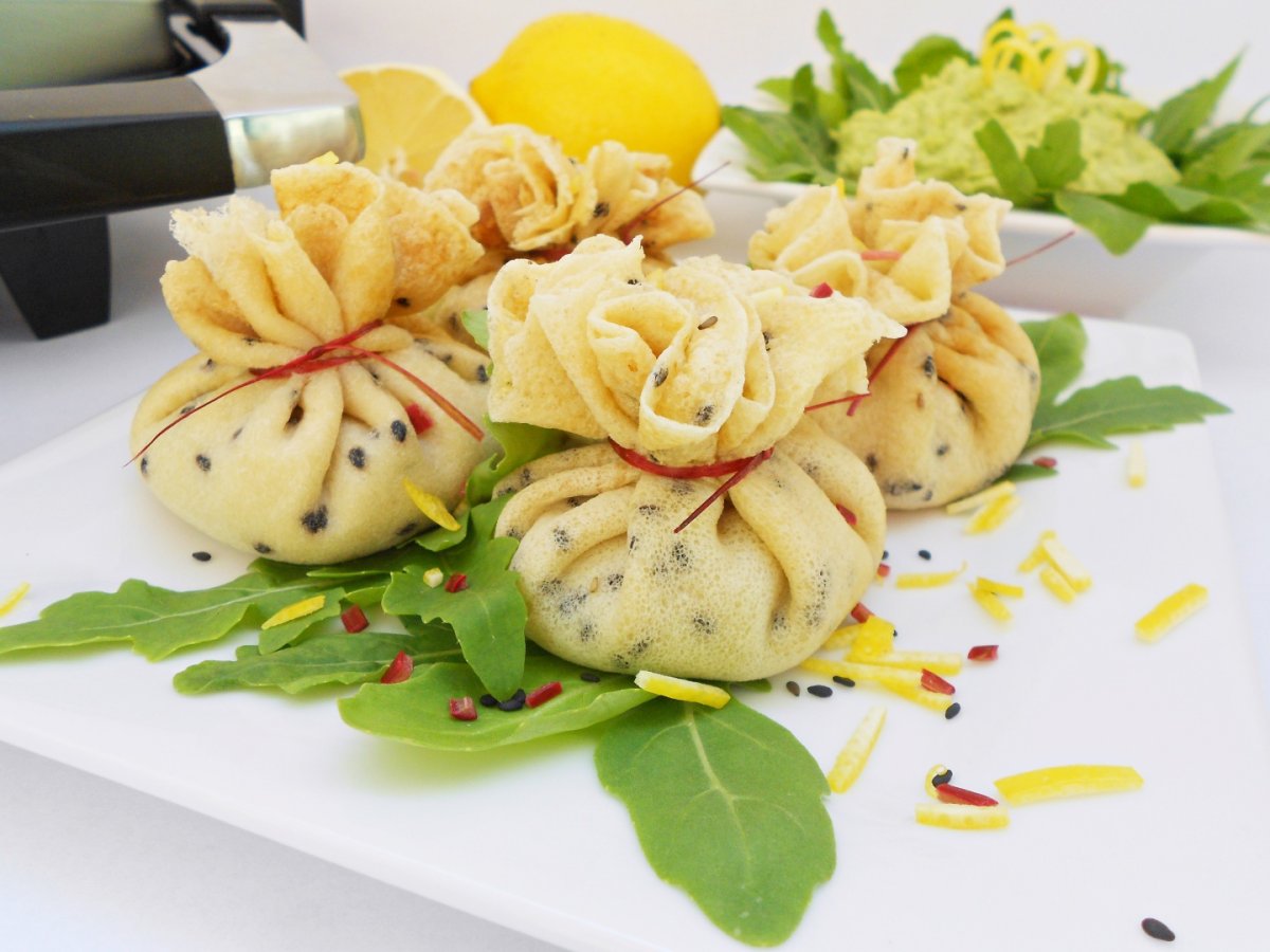 Am așezat peste fiecare clătită puțină mazăre, file de somon și rucola. Am strâns săculeții și i-am legat cu fire rupte din tije de rubarbă.