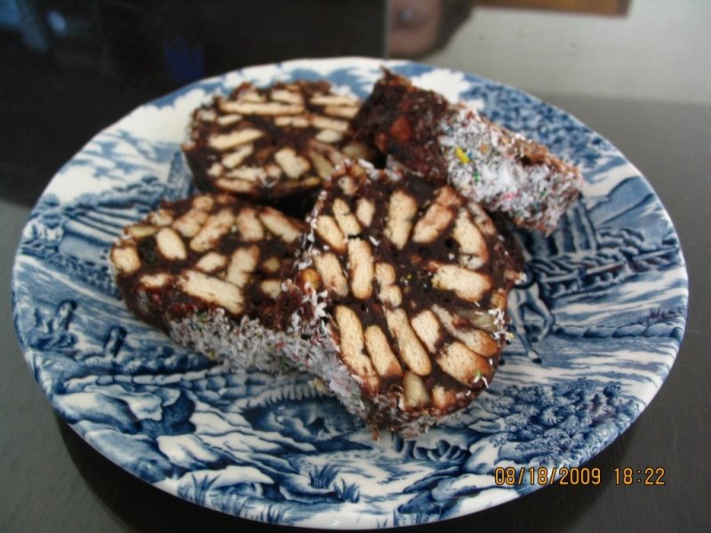 Se pune compozitia intr-o folie transaprenta si se ruleaza ca un baton de salam. Se da la rece pt cateva ore