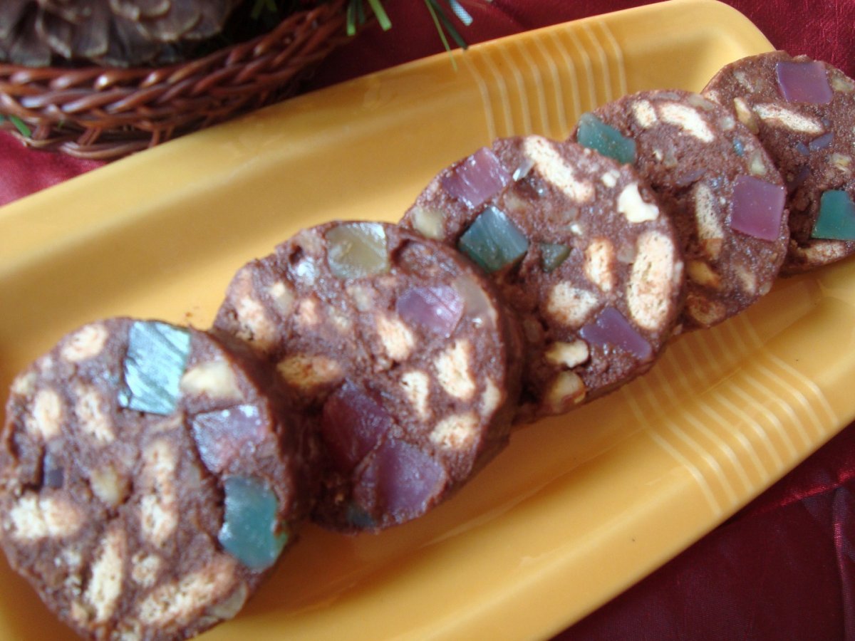 Maruntim biscuitii cu mana in asa fel incat sa ramana bucatele , sa nu se sfarame de tot. Rahatul il taiem cubulete (pentru efectul vizual folosim mai multe culori) iar nuca o macinam dar nu foarte fin. Incalzim laptele impreuna cu margarina cateva minute la microunde . Amestecam biscuitii cu nuca si rahatul, adaugam cacao si esenta de rom si turnam putin cate putin laptele si margarina caldute amestecand pana compozitia devine omogena si nu foarte tare. Daca credeti ca este prea tare mai puneti putin lapte, daca este prea moale mai adaugati biscuiti. Rasturnam compozitia pe un ceolofan , rulam strans dandu-i forma unui salam (de aici provenind si denumirea de salam de biscuiti ) si dam la frigider circa o ora.Dupa ce s-a intarit indepartam folia si taiem salamul de biscuiti felii. Inainte de fiecare felie curatam bine cutitul. Pofta buna!