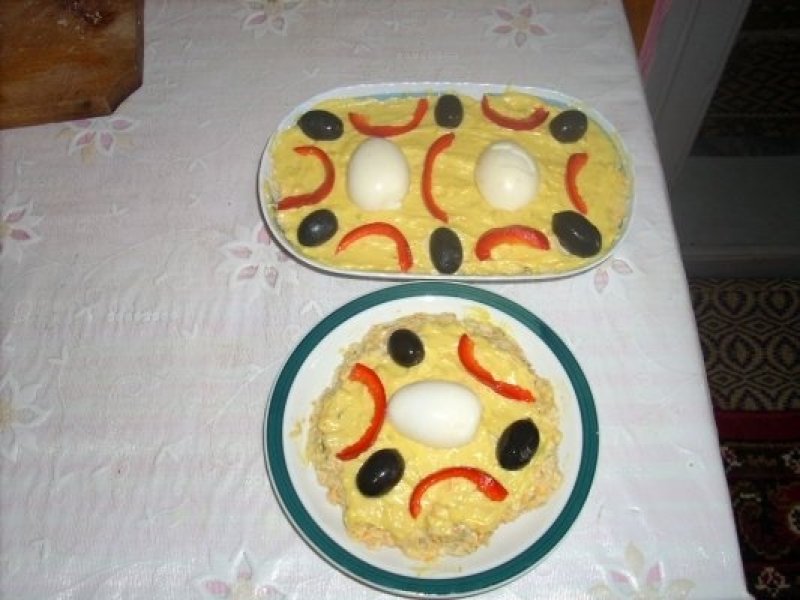 Pieptul de pasare se pune intr-o oala cu apa cu un praf de sare si se spumeaza de cate ori este nevoie. Separat morcovul, cartofii si ciupercile se pun si ele la fiert cu putina sare. Fierbem si 2 oua pentru maioneza. Dupa ce sau fiert legumele dar si pieptul de pui se taie bucati mici. Castravetii si gogosari murati se taie si ei bucati si se amesteca cu legumele si carnea. Maioneza se prepara din doua galbenusuri de ou fierte si doua crude, ulei si putina zeama de lamaie sau putin mustar. Se amesteca toate ingredientele cu trei sferturi din maioneza se pun pe un platou sau farfurie. Se orneaza cu maioneza ramasa gogosar murat, masline si albusul de ou fiert.