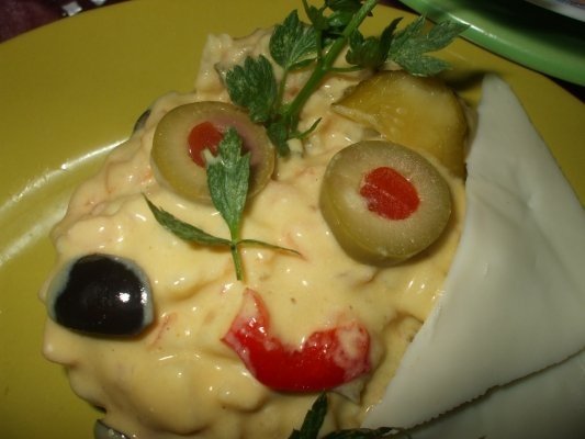 Din galbenusul crud, mustar, sare, piper si ulei preparati maioneza, dregeti-i gustul cu zeama de lamaie si amestecati-o cu celelalte ingrediente. Pastrati 2-3 linguri pentru ornat.