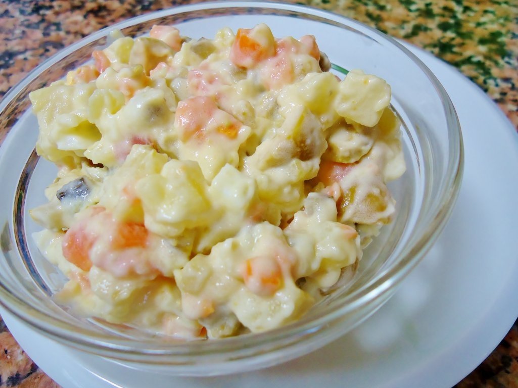 Se fierb cartofii,morcovul si oul.Se lasa sa se raceascu putin si taie in cubulete mici.Maslinele se taie in patru,castraveciorii se taie marunt si se pun la scurs intr-o sita,impreuna cu mazarea.Somonul se taie in suvite micute.Intr-un castron mai mare se adauga cartoful,morcovul,castraveciorii,maslinele,somonul;se amesteca bine,iar la sfarsit oul si mazarea.Se presara sare si se amesteca cu maioneza dupa gust.Eu am pus 9 linguri.Se gusta si se potriveste de sare(in caz ca mai trebuie).Se pastreaza la frigider.Sper sa va placa!!POFTA BUNA!!!