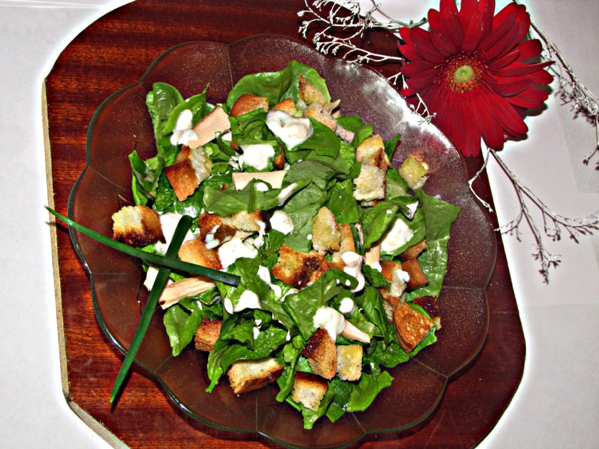 Pieptul de pui se spala, se taie felii ca pentru snitel, se presara sare si piper, iar pe un grill se rumeneste pe ambele parti. Dupa ce se raceste se taie fasii. Se incinge cuptorul. Painea se unge cu usturoi, se stropeste cu uleiul de masline, se taie cubulete si se baga la cuptor pe hartie de copt intr-o tava. Se rumenesc in circa 5-7 minute.