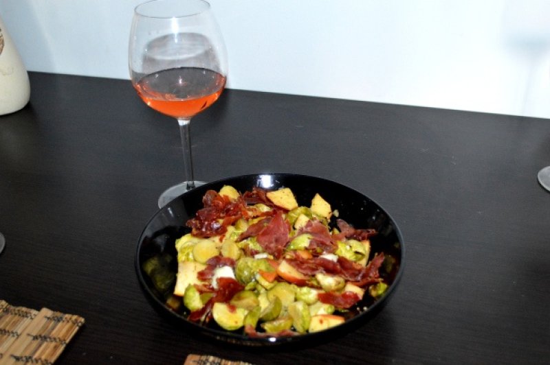 Asezati feliile de prosciutto pe o tava tapetata cu hartie de copt si lasati la cuptor (190 grade) pentru 10 minute. Dupa aceea, asezati peste feliile de prosciutto, pe un singur strat, varza de Bruxelles taiata in jumatati si introduceti din nou la cuptor pentru 15 minute. La final asezati peste si feliile de mar si mai lasati la cuptor 10 minute.