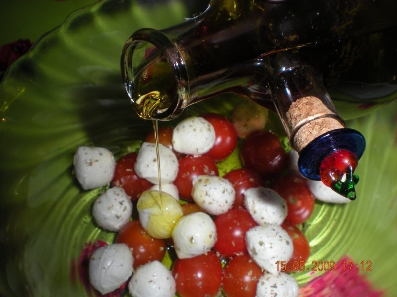 Se spala rosiile, se usuca si se pun intr-un castron. Mozzarrella cherry se scurge de zeama si se adauga peste rosii. Se presara sare, ulei si oregano. Se lasa la frigider 1 ora pentru a fi rece si se serveste. Aceasta reteta de obicei contine si masline. Eu nu am adaugat pentru ca nu imi plac maslinele in salata.