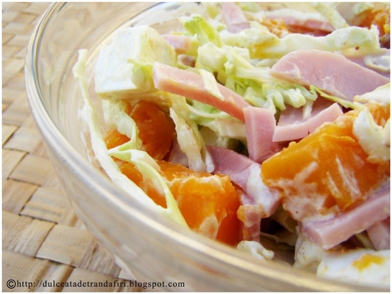 Cartofii, desi par duri, se vor inmuia in 10-15 min, ii verifici oricum cu o furculita. Ii scurgi si ii lasi putin sa se raceasca. Cantitatea de sunca, varza si cartofii, o imparti in cele doua boluri si amesteci cu grija (ca sa nu se sfarame cartofii) , pentru a distrubui cat de cat uniform sosul. Pofta buna!