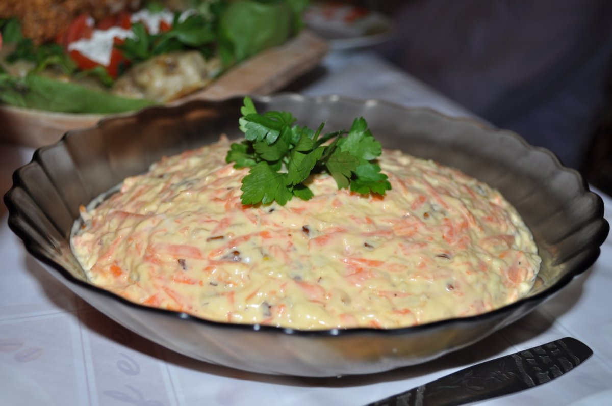 Dam morcovul, cascavalul prin razatoare, pisam usturoiul, macinam nucile si le amestecam cu maioneza. O salata usoara si foarte delicioasa.