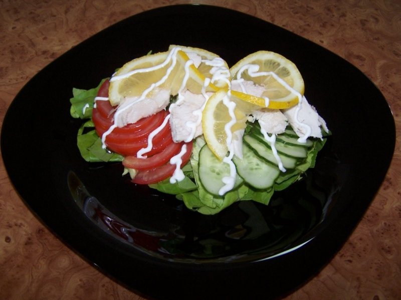 Se aranjaza pe farfurie salata, se pun feliile de rosie, ardei si castravete peste, dupa care adaugam si feliile de pui.