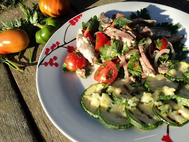 Eu am servit salata cu zucchini: am feliat dovlecelul si l-am presarat cu putina sare; am asezat feliile de dovlecel intr-o tigaie grill unsa cu ulei, incinsa. Le-am lasat pe o parte si pe cealalta, sa se patrunda, dar nu le-am rumenit prea tare. Separat am pisat usturoiul si l-am frecat cu putin ulei, putina zeama de lamaie; am pus si niste patrunjel tocat. Cu sosul acesta am stropit feliile de zucchini.