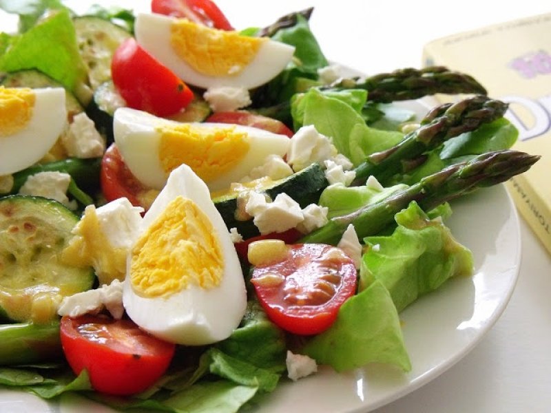 Perpelim cca 3-4 minute in tigaia grill pensulata cu putin ulei,sparanghelul(la care ii taiem capatul distal si il curatam daca are coaja fibroasa cu un peeler) cit si dovlecelul feliat .pe un pat de salata repartizam uniform legumele coapte,jumatatile de rosii cherry ,sferturile de ou si brinza feta .asezonam totul cu dressing-ul format din amestecarea uleiului cu mustarul,pina la omogenizare,apoi adaugarea otetului,incorporarea esalotei tocate ,a sarii si piperului.rezervam la rece cca 10 minute si servim. pofta buna!