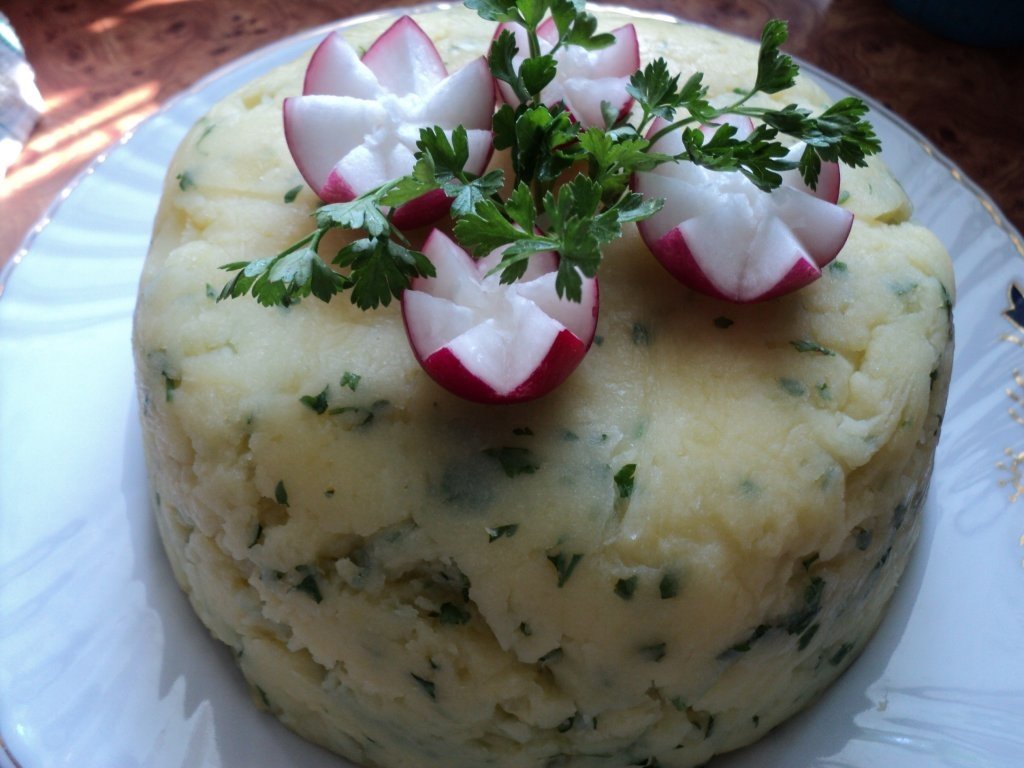 Am fiert mai intai ouale; cartofii curatati si taiati cubulete, i-am fiert ca pentru piure, in apa usor sarata. I-am scurs si i-am zdrobit. Pasta de cartofi am mixat-o impreuna cu patrunjelul tocat, sare, piper si zeama de la o jumatate de lamaie.