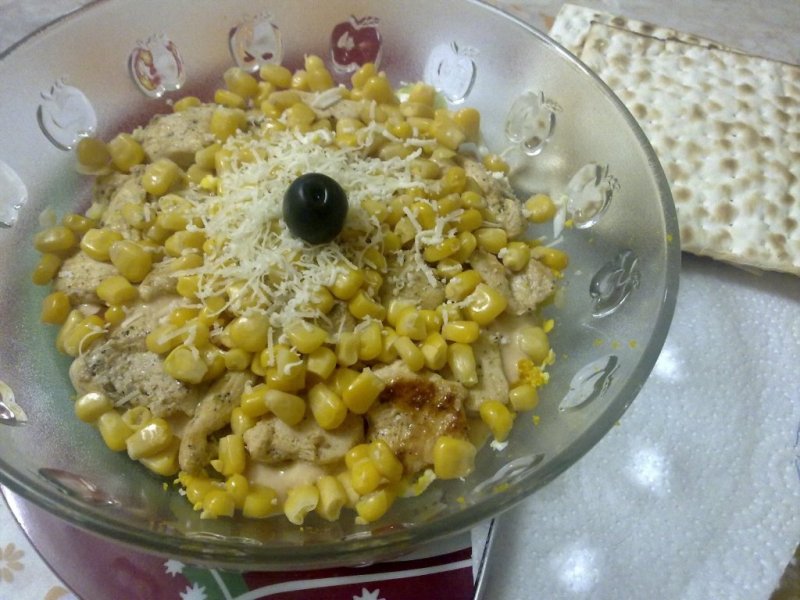 Dupa ce a expirat timpul se spala si taie salata, peste se taie rosiile marunt, ouale se dau pe razatoarea mare. Peste oua se aseaza sosul Thousand Islands, apoi cubuletele de pui si in final porumbul. Se orneaza cu cascaval ras si masline .