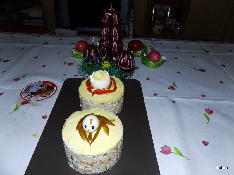 Carnea spalata se pune la fiert iar dupa 15-20min, iar cand a iesit la suprafata spuma neagra, se arunca apa, se spala carnea si se pune din nou la fiert cu putin zahar. Se procedeaza asa pentru ca aspectul final al salatei sa nu fie de culoare inchisa;dupa ce carnea este aproape fiarta,se adauga legumele impreuna cu 2 linguri de sare.Cat timp fierbe totul,se pregateste maioneza: intr-un castron se freaca galbenusul fiert cu mustar,dupa ce este omogenizat,se adauga uleiul cate putin, apoi galbenusurile crude, turnand in continuare ulei, intercalat cu zeama de lamaie. Dupa ce si-a dublat volumul,sau chiar s-a triplat, se lasa la frigider.Odata ce ai fiert carnea si legumele se scot,se taie marunt. Se adauga castravetii si sare (daca e nevoie),piper,maioneza si se amesteca bine. Se pune salata pe platou si se orneaza dupa preferinta.