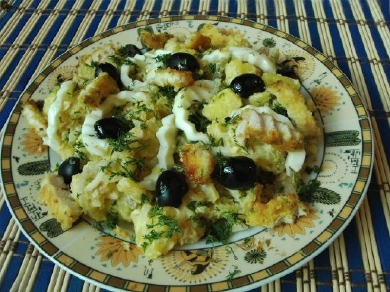 si maioneza si se amesteca bine. Se aranjeaza salata si se orneaza cu albusuri de ou fasii sau zapada , marar tocat matunt si masline .se stropeste cu zeama de lamaie si ulei de masline .