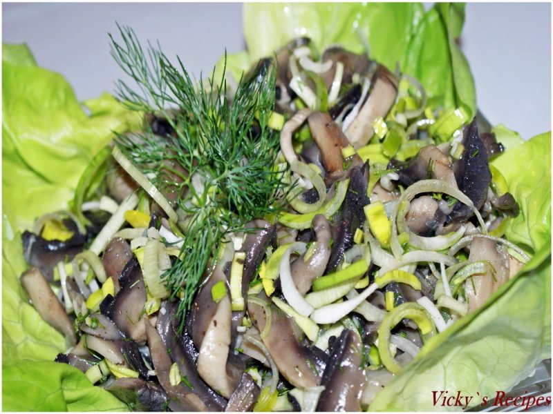 Într-un castron se amestecă prazul tăiat, ciupercile feliate, mărarul tocat și se adaugă dressingul preparat prin amestecarea uleiului și oțetului. Se asezonează cu sare și piper, după gust.