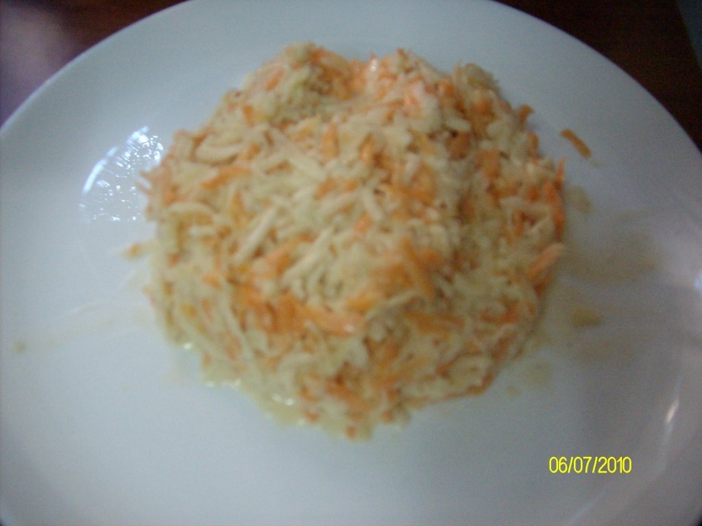 Telina,morcovii si pastarnacul se dau pe razatoare.Marul se curata de coaja se da pe razatoare si se pune in zeama de lamaie apoi se amesteca cu restul.