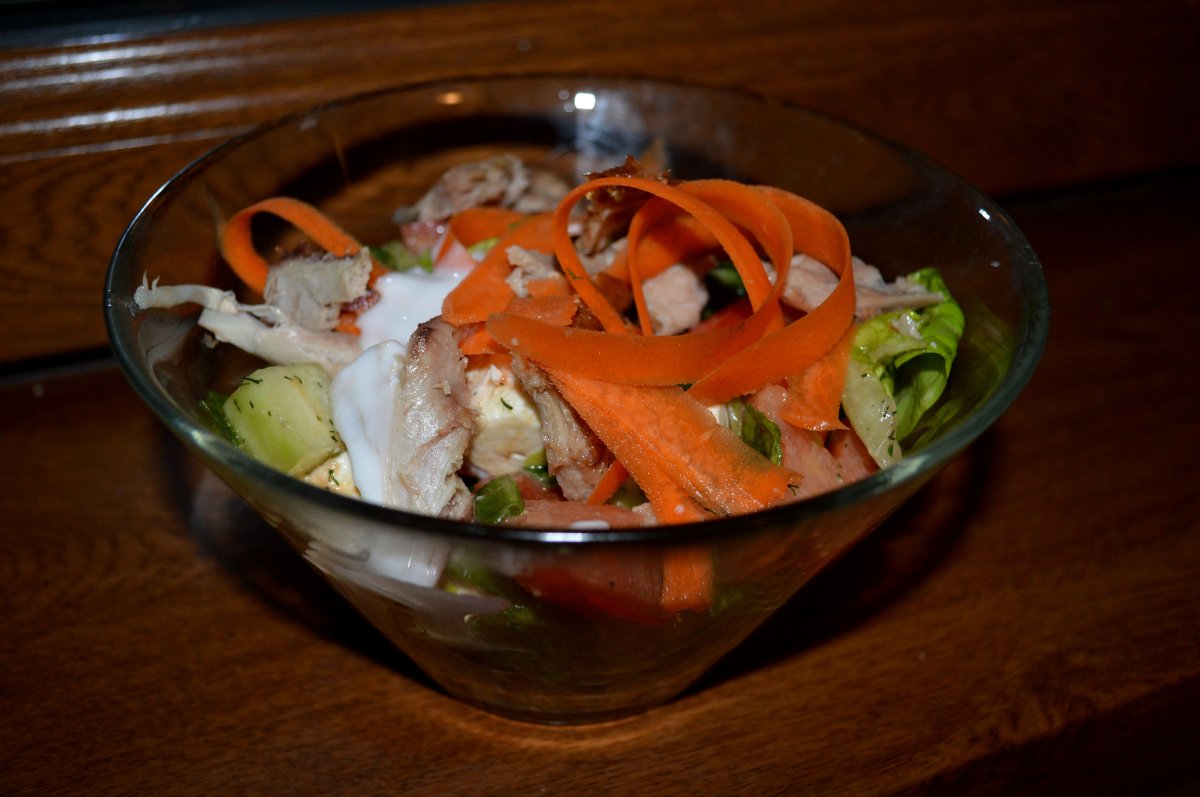 Pentru dressing trebuie sa amestecati intr-un borcanel uleiul de masline (eu am pus 3 linguri), otetul balsamic (5-6 linguri dupa gust), mustarul si sosul worcestershire. Inchideti borcanul si agitati foarte bine, apoi adaugati din belsug sosul din bol. Puteti adauga si putina grasime ramasa de la piept, ii va da o aroma deosebita. Va recomand sa va folositi mainile pentru a amesteca salata foarte bine si astfel sa va asigurati ca fiecare leguma va fi imbracata in dressing.