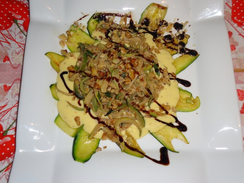Asezam baza salatei feliile intregi de dovlecel peste ele punem sos cat dorim, iar apoi asezam salata piramida, un pic ridicata.