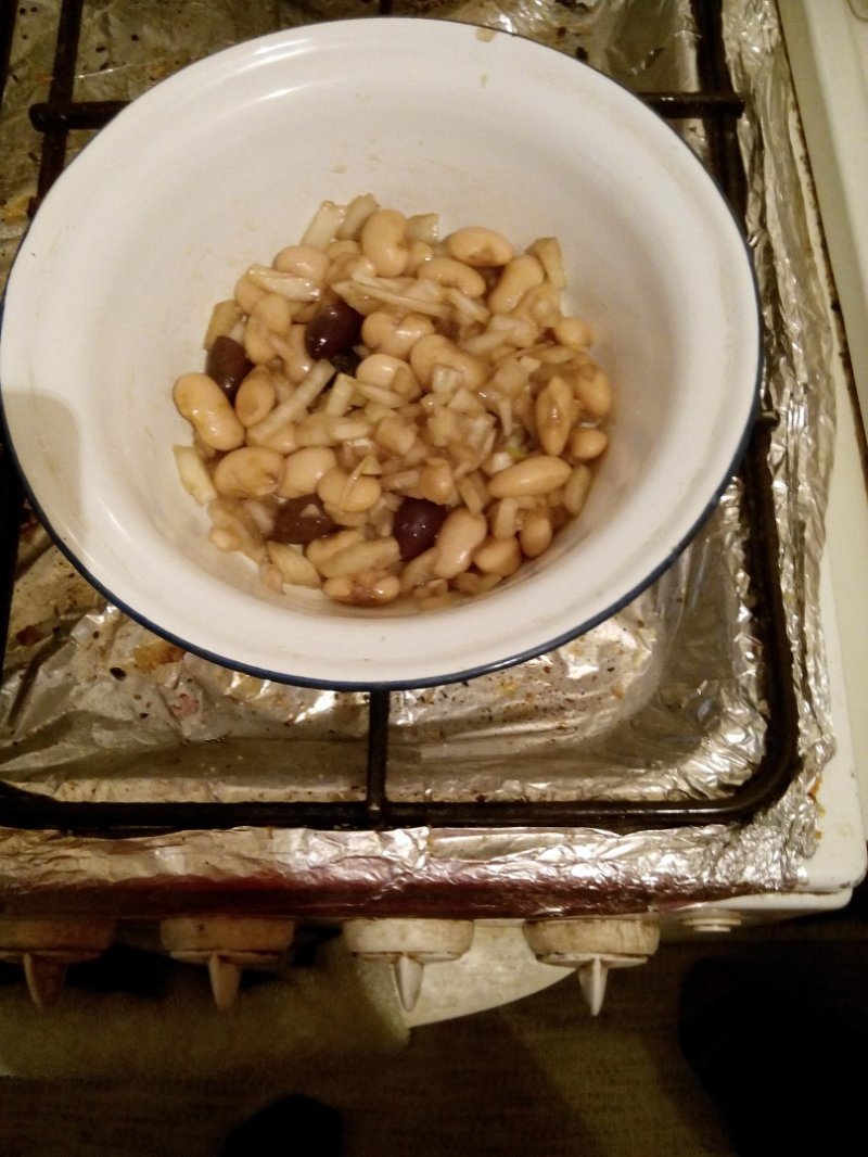 Fasolea alba se fierbe schimndu-se 3-4 ape. In ultima apa se pune si sare. Dupa ce a feirt se scurge si se adauga ulei. Ceapa se taie felii, se sareaza, se lasa sa stea o ora se stoarce, se scurge si se adauga fasolea impurena cu uleiul, otelul, piperul, sarea si maslinele.
