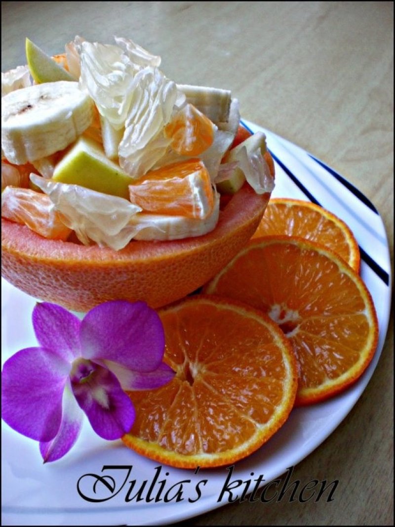 Am umplut jumatatile de grapefruit cu fructele cubulete si gata salatica. Servim cu frisca sau inghetata. Delicioasa!
