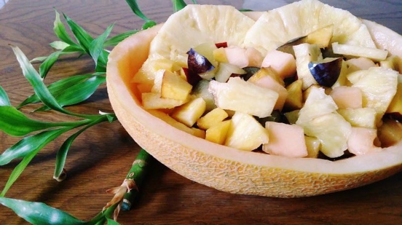 Pepenele l-am scobit si l-am transformat in bol. Initial planuisem sa fac acest lucru cu ananasul, dar s-a dovedit o treaba mult prea complicata pentru mine, asa ca ananasul a sfarsit taiat rondele in modul clasic.