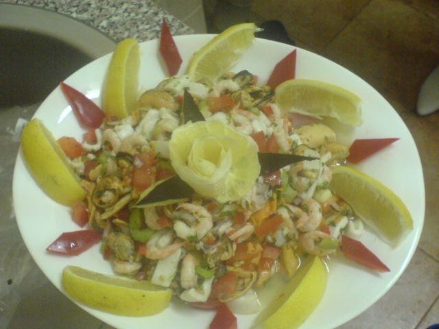 Fructele de mare se pun la marinat(3-4 ore)cu zeama de lime, capatana de usturoi taiata in jumatate, sare, piper si putin ulei de masline. Dupa 3-4 ore se adauga legumele taiate cuburi si verdeata. Se amesteca bine, se scurge marinata si se inlatura usturoiul.