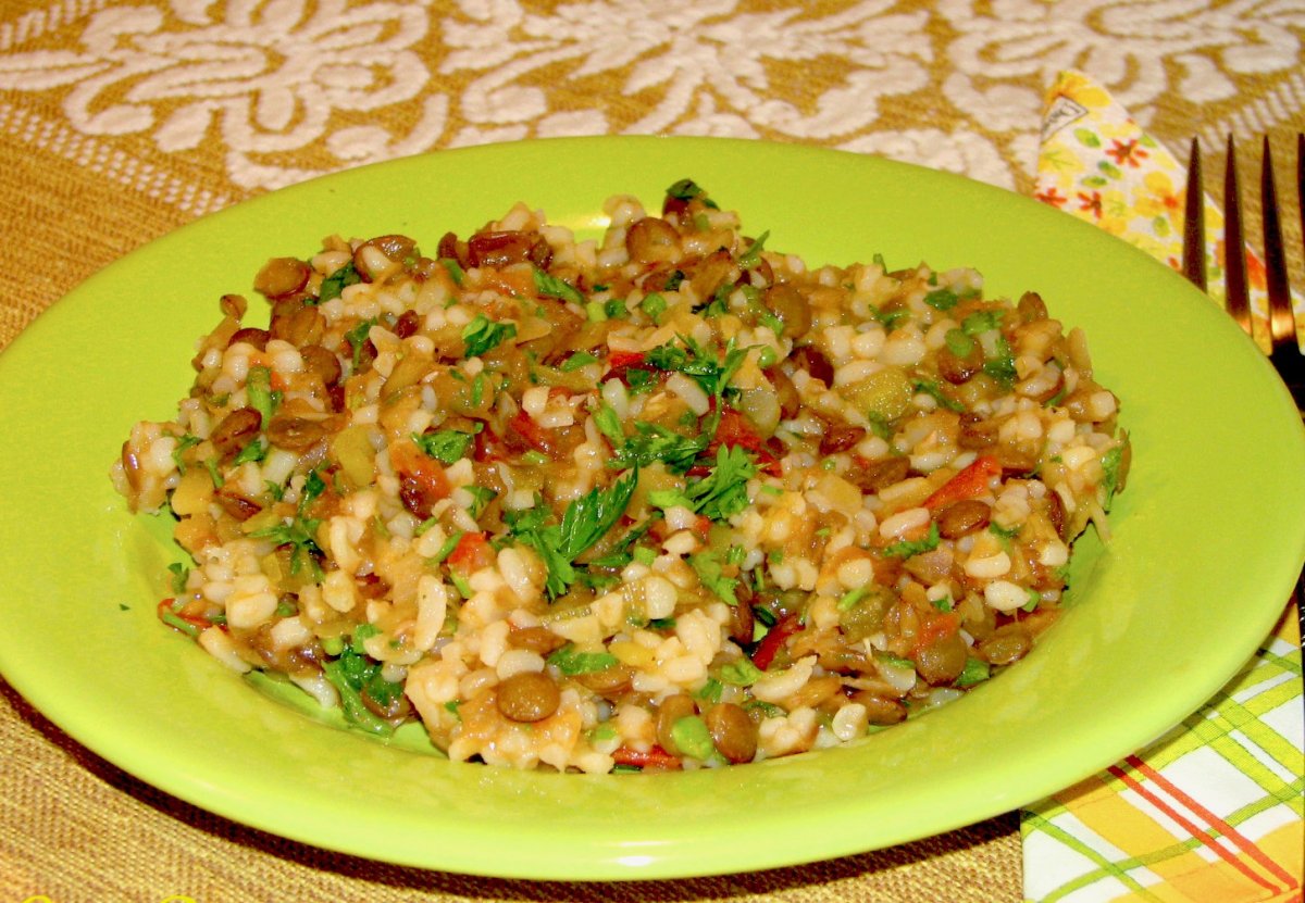 Separat, se fierbe lintea, schimbandu-se apa de doua ori. Cand e bine fiarta, o strecuram si o adaugam impreuna cu bulgurul ( pe care l-am fiert 5 minute in apa cu sare, apoi l-am strecurat ) peste amestecul de rosii.