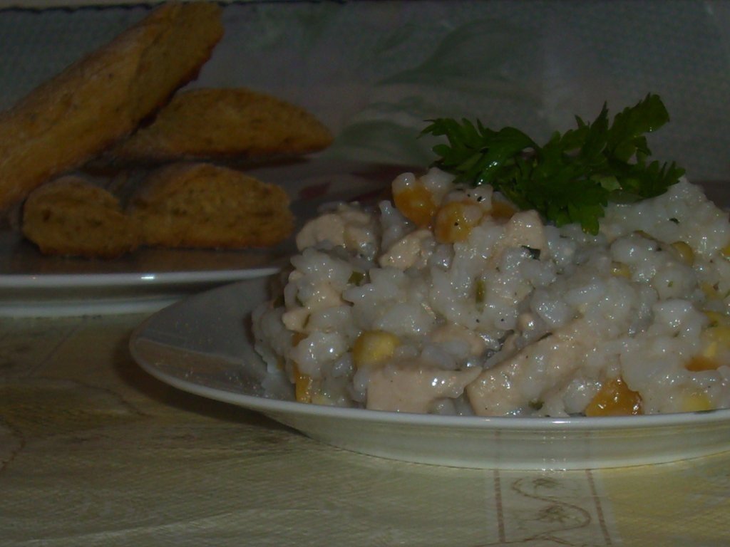 Cat timp fierbe orezul, taiem pieptul de pui in patratele mici si il punem la prajit in putin ulei de masline impreuna cu cateii de usturoi taiati marunt si patrunjelul tocat fin.