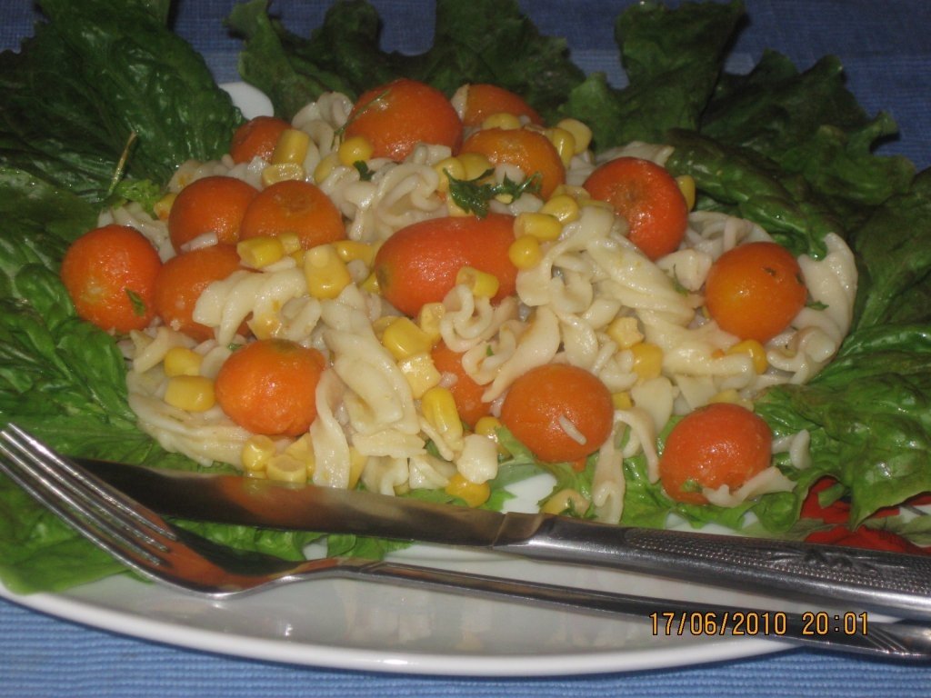 Se fierb pastele in apa cu un strop de sare, conform instructiunilor de pe ambalaj,apoi se scurg de apa ,se trec printr-un jet de apa rece si se lasa la scurs.Porumbul din conserva se scurge ,se spala cu apa rece si se lasa si el la scurs intr-o strecuratoare.Carotele se fierb in apa , dupa care se scot pe o farfurie cu ajutorul unei palete.