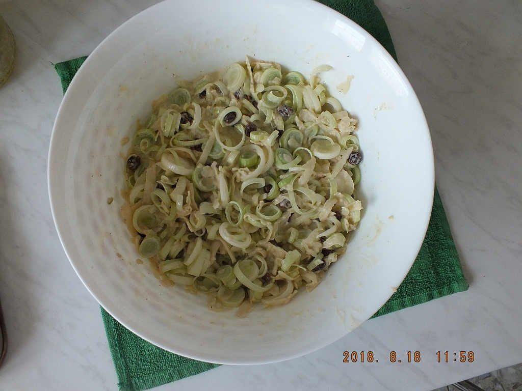 Intr-un bol, se amesteca rondelele de praz cu marul ras, stafidele stoarse, maioneza, sarea, piperul si zeama de lamaie. Se dau la rece pentru 30 minute.