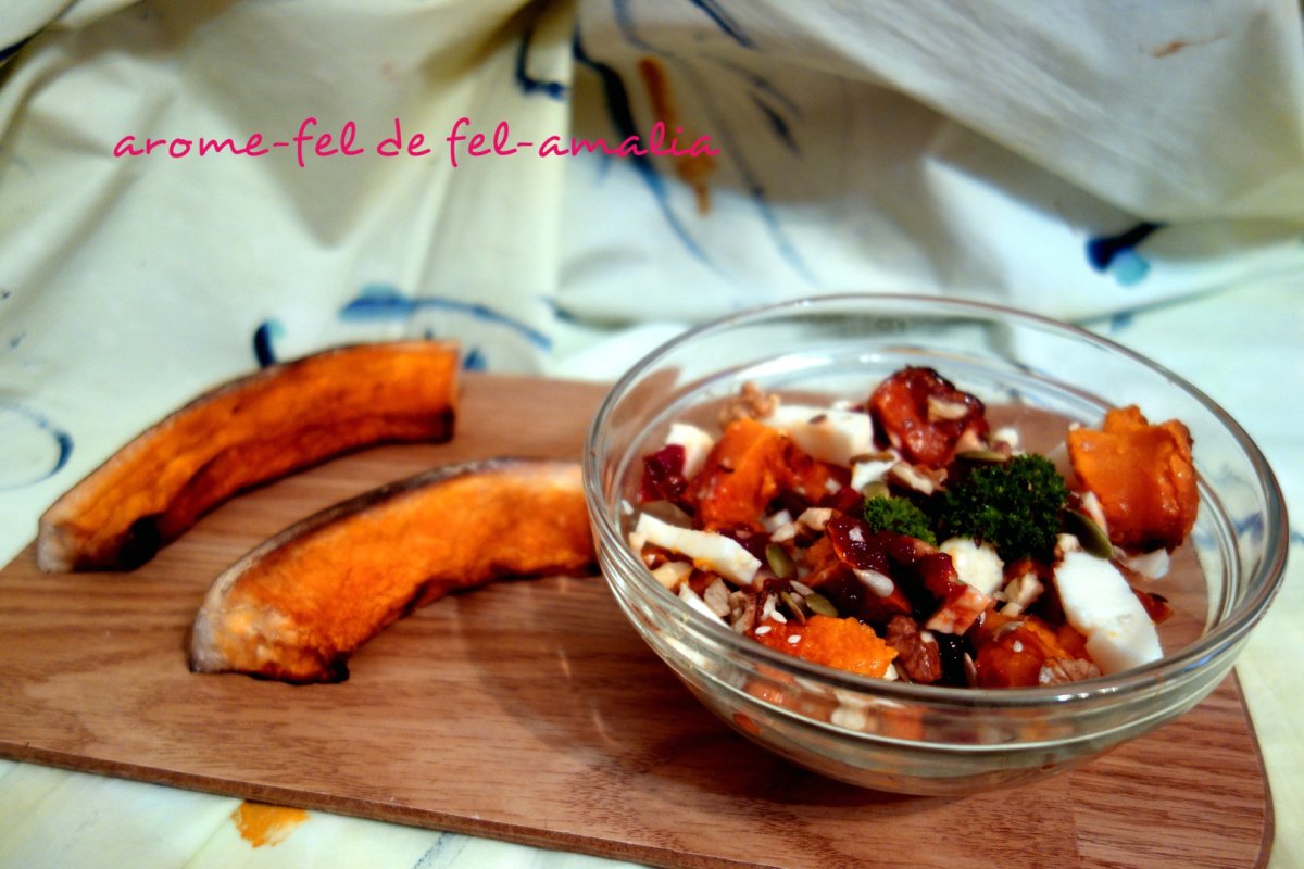 Am taiat si branza cubulete si am adaugat-o peste dovleac. Am rupt nuca bucati si am presarat-o peste amestec, turnand inca putin ulei de masline.