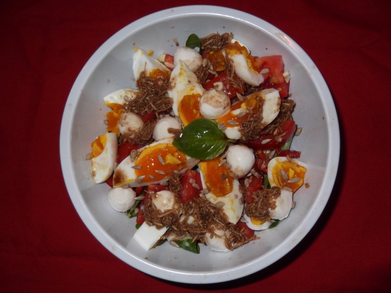 Spălăm valeriana, o scurgem apoi o așezăm într-un bol peste care adăugăm ardeiul kapia tăiat feliuțe, roșiile, usturoiul tăiat cubulețe mici, ouăle, mozzarella și semințele de floarea soarelui. Apoi, facem un dressing din oțet balsamic, ulei de măsline și hrean, care îl turnăm peste salată.