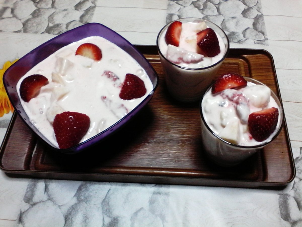 Curatam kiwi si para de coaja. Spalam mar si capsuni. Taiem fructele cubulete. Adaugam zahar/miere si zeama de lamaie amestecam usor.Adaugam iaurt si amestecam usor sau puteti lasa asa. Punem in boluri/pahare si lasam la rece pana in momentul servirii.
