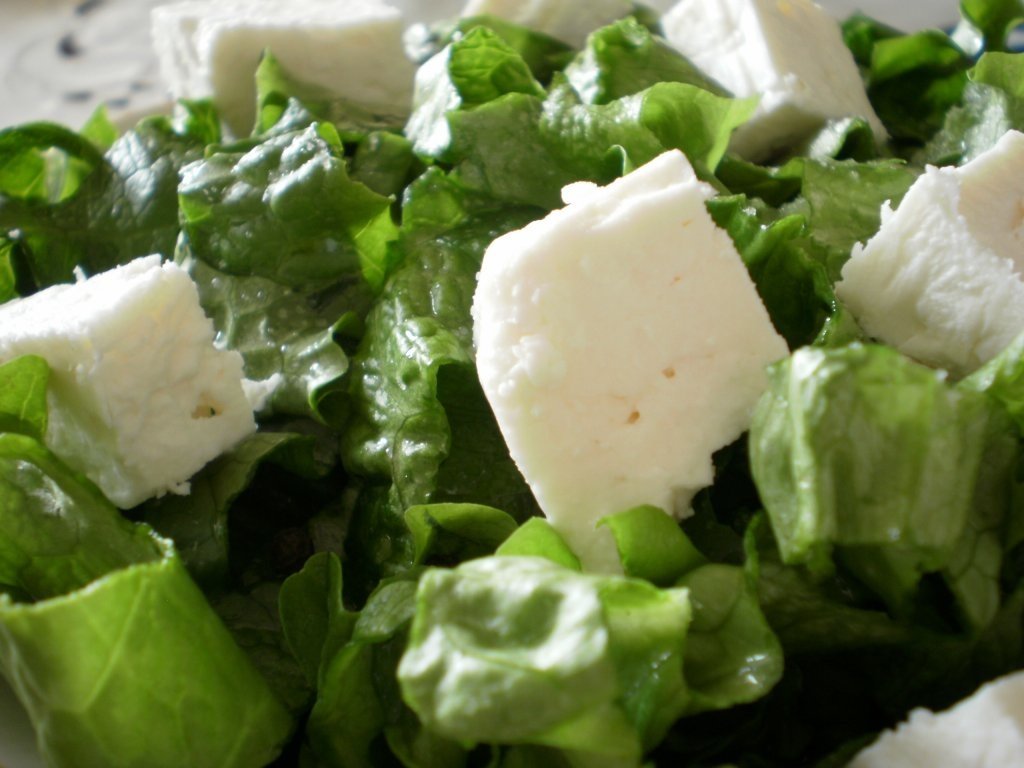 Se spala salata creata, frunza cu frunza. Se taie partile mai tari. Se usuca cu un servet curat frunzele de salata, inainte de a fi puse in bol. Se rup cu mana sau, cine prefera, se taie fin cu un cutit ascutit, dupa care se adauga intr-un bol sau o farfurie adanca. Se spala ceapa, se taie "mustatile" sau radacinile si varfurile frunzelor. Se taie marunt si se adauga in bol. Se adauga uleiul, otetul, sarea si piperul. Se amesteca cu doua spatule. Se adauga la final branza taiata in cubulete.