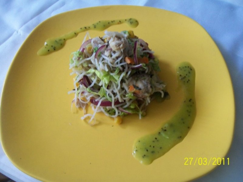 Putem sa facem si un sos din fructele de kiwi, care se taie in bucati mai mici si se vor blenda iar sosul rezultat se va strecura printr-o sita foarte fina. Se poate atat decora cu acest dressing cat si servi.