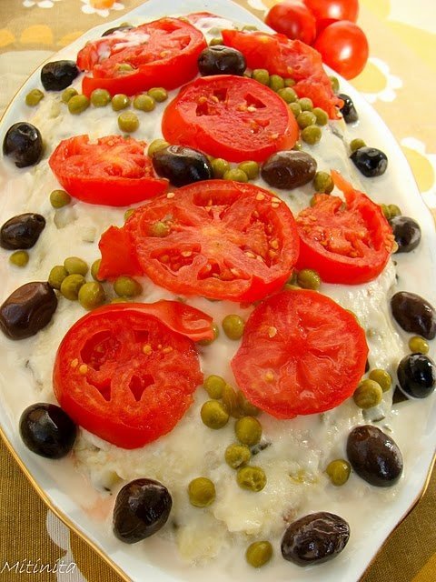 Se amesteca usor toate ingredientele si se orneaza cu masline si felii de rosii.