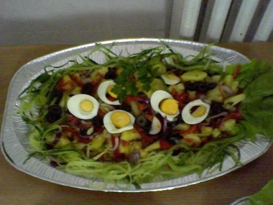 Cartofii se curata, se spala si se fierb in coaja. Apoi se curata si se taie rondele sau cuburi dupa preferinta. Ceapa se curata, se toaca solzisori, ardeiul gras se curata, se spala si se taie fasii. Se amesteca toate legumele cu maslinele, ulei, sare, piper si dressin knorr ardei si verdeturi. Oul se fierbe si se taie rondele. Se aseaza pe platou sau farfurie pe frunze de salata verde si rondele de ou.