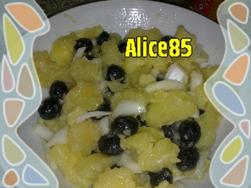 Cartofi cu tot cu coaja ai punem la fiert 35-40 de minute____Ai scoatem si ai lasam sa se raceasca putin,apoi ai curatam de piele si ai taiem dupa plac (eu i-am taiat in bucatele mai mari)____Peste ei adaugam ceapa taiata solzisori ,maslinele,otetul,sarea, uleiul de masline ,patrunjelul si amestecam bine.Servim.Pofta Buna!