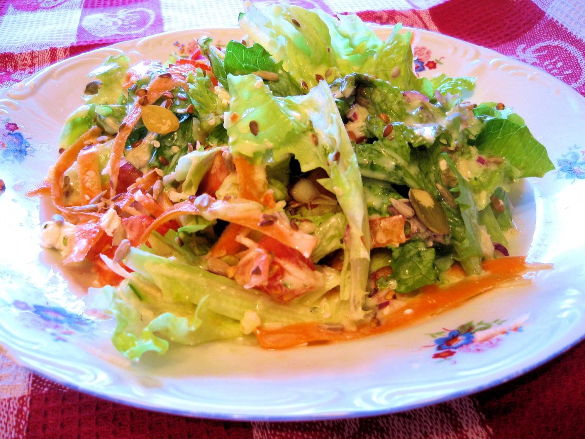 Intre timp, morcovii se curata si se taie fasii, salata se rupe bucati sau se lasa frunze intregi daca acestea sunt micute, marul se taie fasii sau se da pe razatoare, ardeiul, ceapa si castravetele se taie fasii, iar semintele se presara deasupra, se adauga sosul si e gata.
