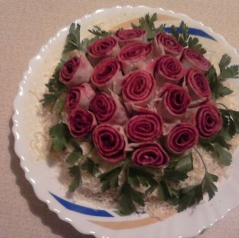 6.Se unge cu atentie fiecare clatita cu amestecul de sfecla,se ruleaza si se taie transversal in bucati mici de aproximativ 1,5 cm,care se aseaza pe farfurie ca niste “rozete”,in jurul carora se pune verdeata din belsug.