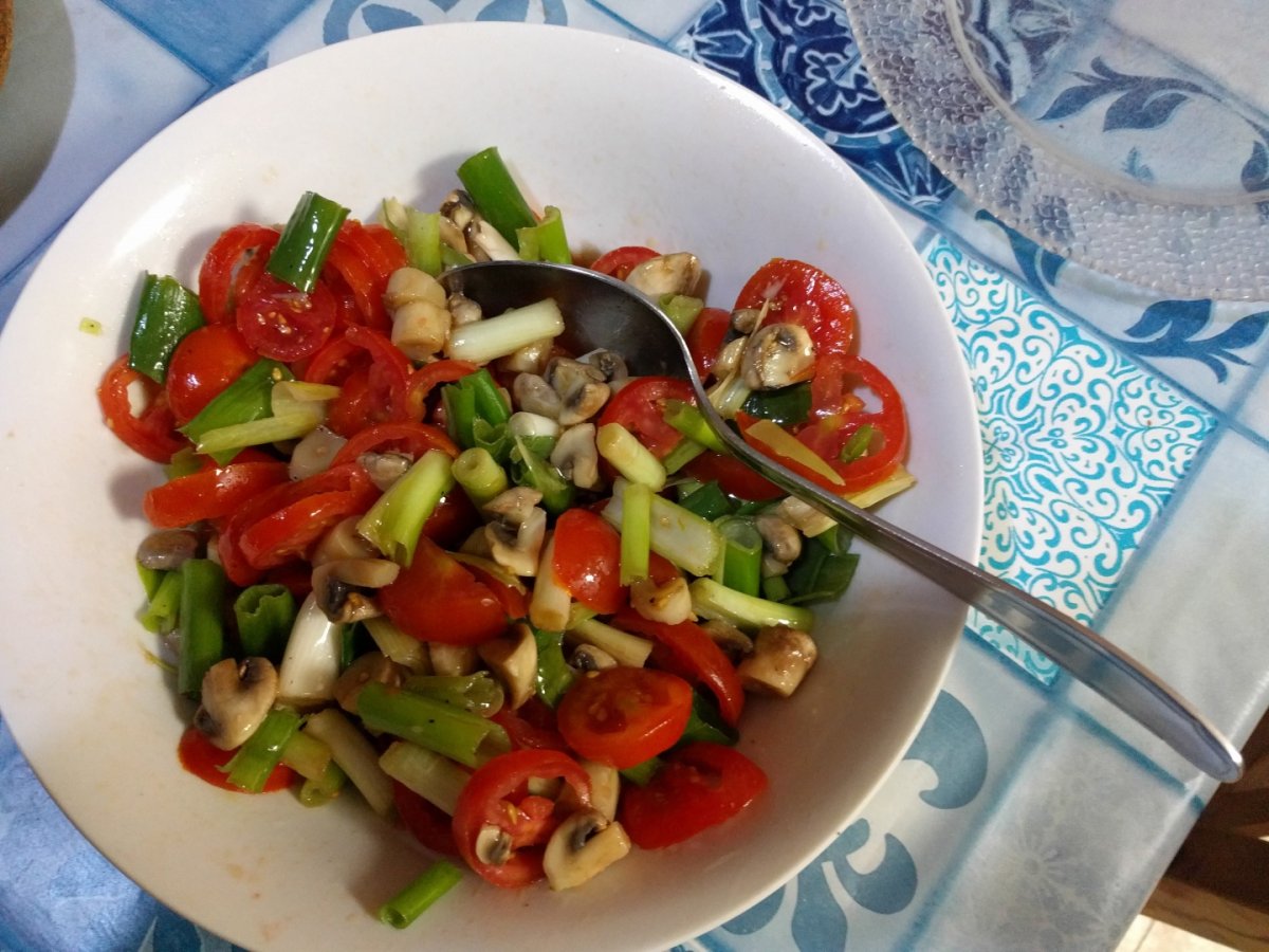 Rosioarele le taiem felii si ceapa de asemeni; combinam totul si facem un sos din o lingura de otet cu 3 linguri de ulei de masline, putina sare si piper.