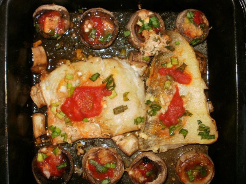 Pasul 3. Pestele, peste care s-a pus sos Cirio, ceapa verde si usturoi, este asezat in tava pe un pat facut din piciorusele ciupercilor. Palariile umplute sunt asezate de jur imprejurul pestelui.