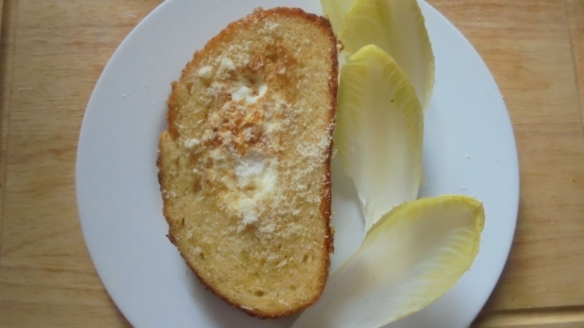 Decupam la mijloc feliile de paine si le punem apoi in tigaie sa se rumeneasca in untul topit (inclusiv mijlocul scos). Spargem cu grija cate un ou intreg in mijlocul fiecarei felii de paine, presaram putina sare si lasam la foc mic spre mijlociu sa se rumeneasca pana vedem ca oul s-a coagulat suficient. Cu o paleta,eventual ne ajutam de inca una, intoarcem feliile de paine in tigaie, dupa ce am pus peste ele si lamelele de unt ramase. Lasam sa se rumeneasca si pe partea a doua, apoi le scoatem pe o farfurie. Le suprapunem, punand la mijloc miezurile rumenite. Daca dorim, putem presara intre felii putin parmezan. Se pot pune intre frunze de salata verde sau andive crude si servite ca sandvis. Daca dorim sa punem sandvisul la pachet, de exemplu pentru copil la scoala, trebuie sa il prajim putin mai mult, pentru ca galbenusul sa nu curga atunci cand musca din el, dar daca il servim la micul dejun, putem sa le lasam putin mai moi (dupa dorinta).