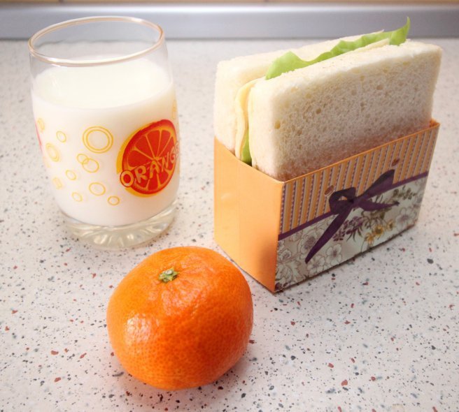 Eu am folosit felii de miez de paine. Puteti sa folositi si felii de paine integrala sau sau cu cereale dar fara coaja. Asezam pe primele doua felii de paine cate 1 felie de cascaval, 2 felii de sunca de pui, cate 1 frunza de salata verde si inca 1 felie de cascaval pe fiecare felie. Acoperim cu celalate 2 felii ramase.