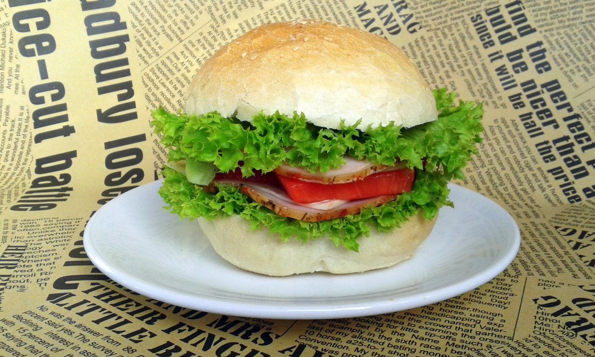 Sandvis Yam-yam. Se taie salata, pastrandu-se doar partea de sus, creata, si se pune o frunza pe chifla (partea inferioara).