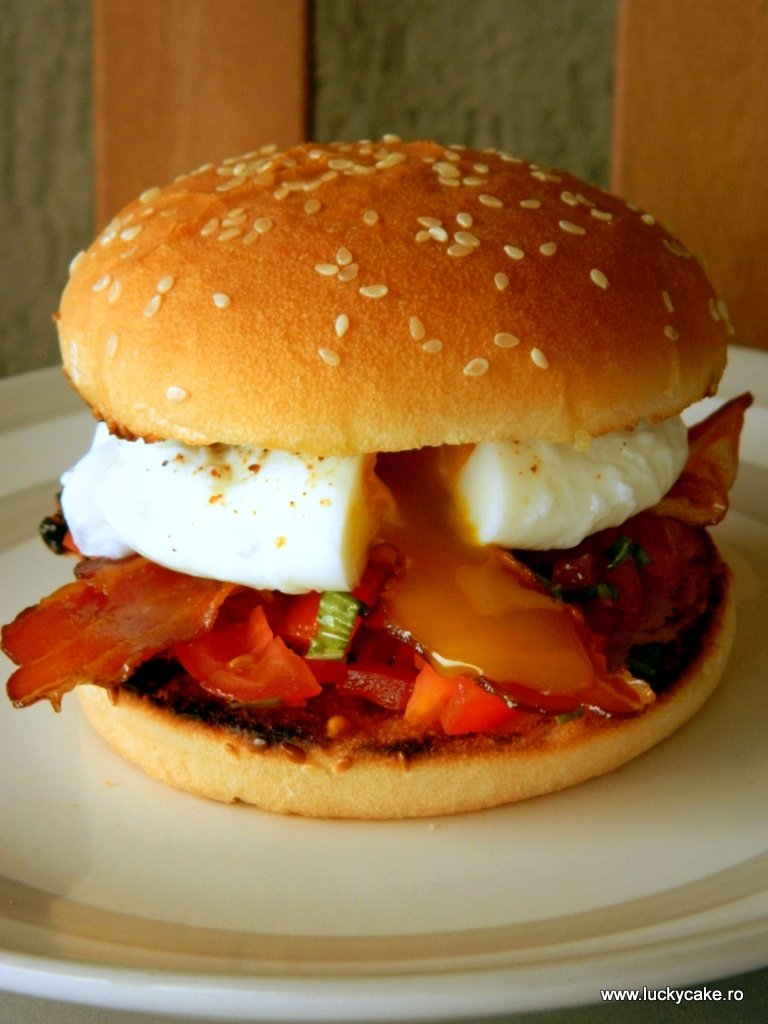 Baconul il prajim in cuptor pana devin crocante, rosiile le taiem cubulete, la fel si busuiocul, le amestecam si le condimentam cu sare si piper si putin ulei de masline. Chiflele le taiem in 2 , le ungem cu putin unt si apoi le punem la prajit intr-o tigaie de grill pana se rumenesc. Acum trecem la asamblarea lui: pe chifla punem rosiile, apoi feliile de bacon, iar deasupra ouale si cealalta jumatate de chifla.