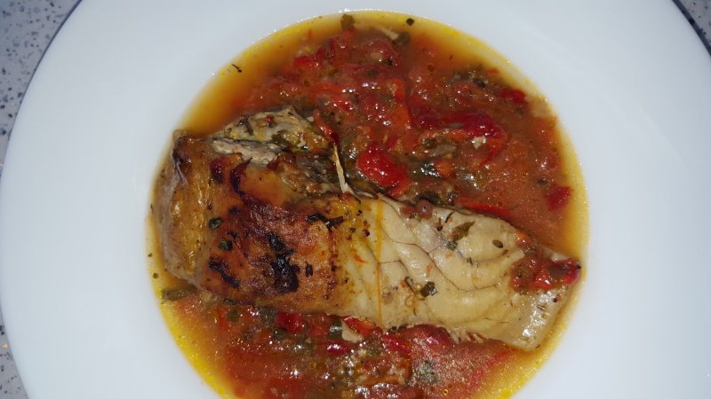 Pestele portionat se unge pe ambele parti cu putin ulei si condimente si se da la rece cateva ore. Ungem o foaie de aluminiu cu ulei de masline, asezam cate 3 buc de peste si-i ungem si pe deasupra. Strangem folia pachet si intoarcem marginile pliate in sus sa nu se scurga zeama in tava. Dam la cuptor la 200 de grade timp de 30 de minute, desfacem folia si mai lasam 5-10 minute. Asezam kapia, rosiile, ardeiul iute si usturoiul pe o folie de aluminiu si dam la cuptor la 200 de grade. Din cand in cand le puteti intoarce sa se faca pe toate partile. Cand s-au copt le punem intr-un vas, punem sare pe ardei si le acoperim pana se racesc. Le decojim si taiem ardeii si rosiile marunt. Daca puteti scoateti pulpa de la usturoi sau folositi-l cu tot cu coaja la saramura doar sa-i dea gust. Punem apa la fiert impreuna cu cimbrul, foile de dafin, si 2-3 catei de usturoi crud trecut prin presa. Cand a dat in clocot punem restul ingredientelor si 1/2 patrunjel tocat. Lasam sa scada saramura cam la jumate, punem restul de verdeata, putin ulei de masline si lingura de otet. Gustam si potrivim de sare. Asezam pestele intr-o tava, scurgem si zeama ramasa in folie, punem saramura si dam la cuptor inca vreo 30 de minute sa mai scada. Pestele trebuie sa fie acoperit in totalitate de zeama. Eu am folosit doar cateva felii de ardei iute pentru ca am pus mai mult piper. Pestele ar fi bine sa fie taiat rondele potrivite. Daca va place sosul mai legat o alta varianta ar fi sa blenduiti toata compozitia dupa ce a fost fiarta. Saramura este buna atat rece cat si calda. Daca doriti o reteta mai rapida : faceti un sos din rosii, ardei gras si iute si usturoi coapte si maruntite la blender impreuna cu putin ulei de masline, usturoi crud si patrunjel verde. Pestele scos din folie se pune imediat cat este inca fierbinte in acest sos, se lasa putin sa-si ia gust si se serveste fara sa-l mai dati la cuptor.